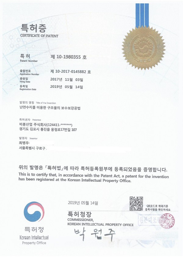 | 11 | 초속경 고강도 콘스틸 씰을 이용한 구조물 보수및 보강 공법 특허 (특허 제 10-1761733호) | 관리자 | 2017.07.28 | 2058 | |||