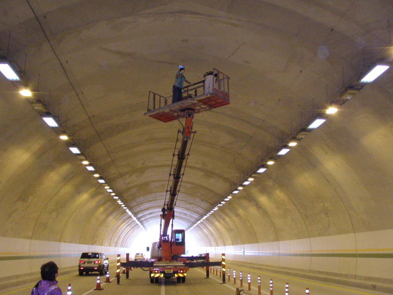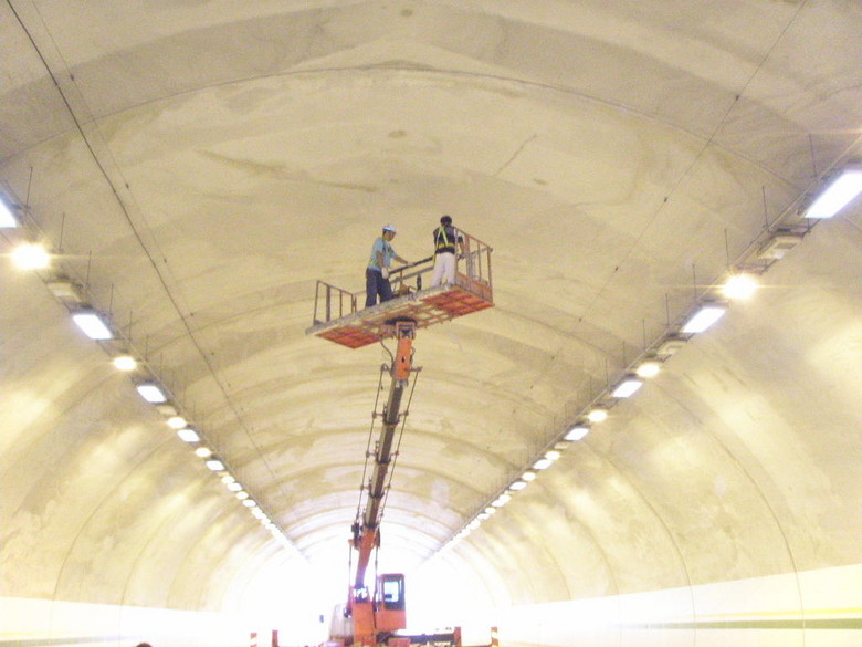 터널내 보강공사로 주사기를 이용하여 에폭시 주입제를 주입하여 크랙을 보강하고