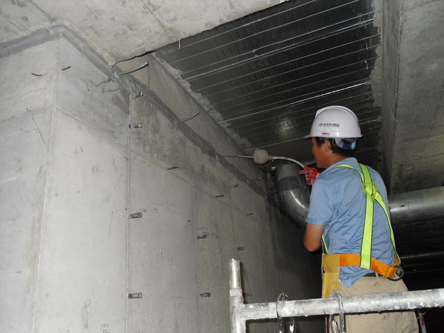 균열부위에 패커를 드릴로 천공하여 우레탄 지수재 BU-50F (경질) 또는 BU-50(연질) 을